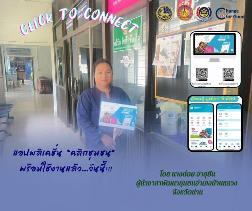 อำเภอบ้านหลวง โดย นางต๋อม อายุยืนผู้นำอาสาพัฒนาชุมชนอำเภอบ้านหลวง จังหวัดน่าน ร่วมประชาสัมพันธ์การดาวน์โหลดและการใช้งานแพลตฟอร์มบริการดิจิทัล Click ชุมชน เพื่อใช้ประโยชน์ในการวางแผนพัฒนาคุณภาพชีวิต กระตุ้นเศรษฐกิจชุมชน สร้างอาชีพ สร้างรายได้ เพิ่มความรู้ และส่งเสริมความเป็นอยู่ที่ดีของประชาชน ซึ่งกรมการพัฒนาชุมชนได้ยกระดับคุณภาพบริการ “Click ชุมชน” ให้เป็นแพลตฟอร์มบริการดิจิทัลครบวงจร One Stop Service